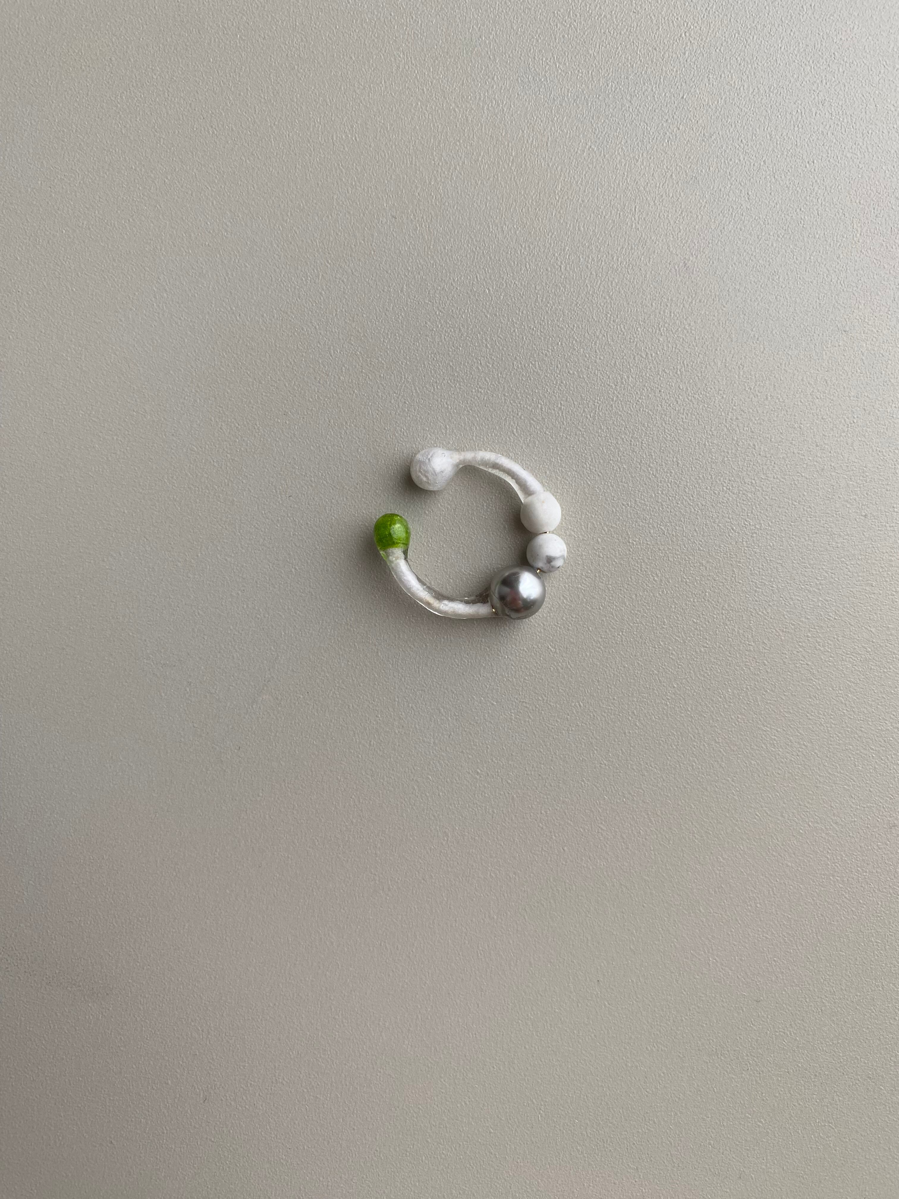 合わせたガラス、ビーズ、パールなどが、軌道をすすむ惑星のように見えたので〈planetイヤーカフ〉と名付けました。