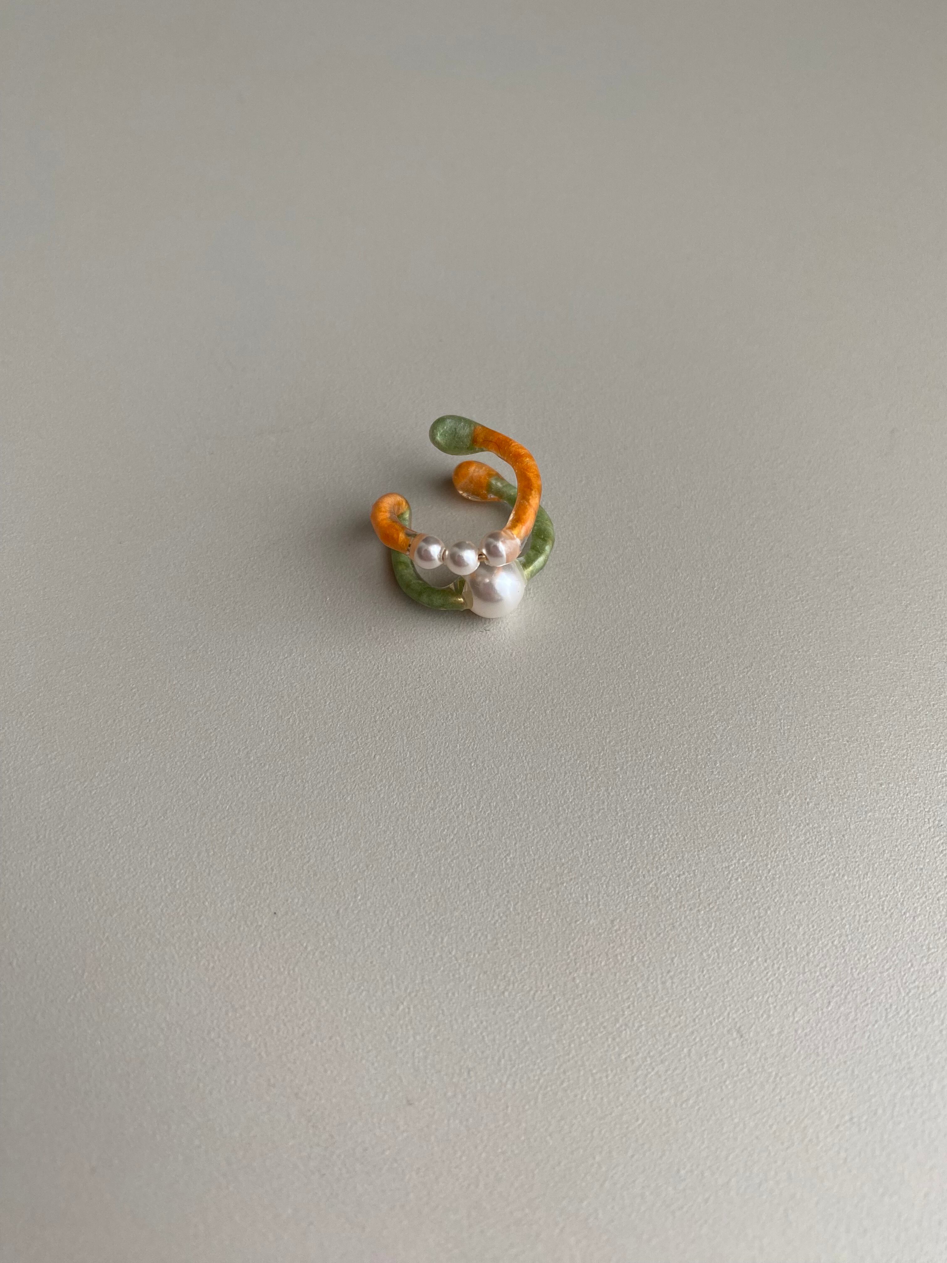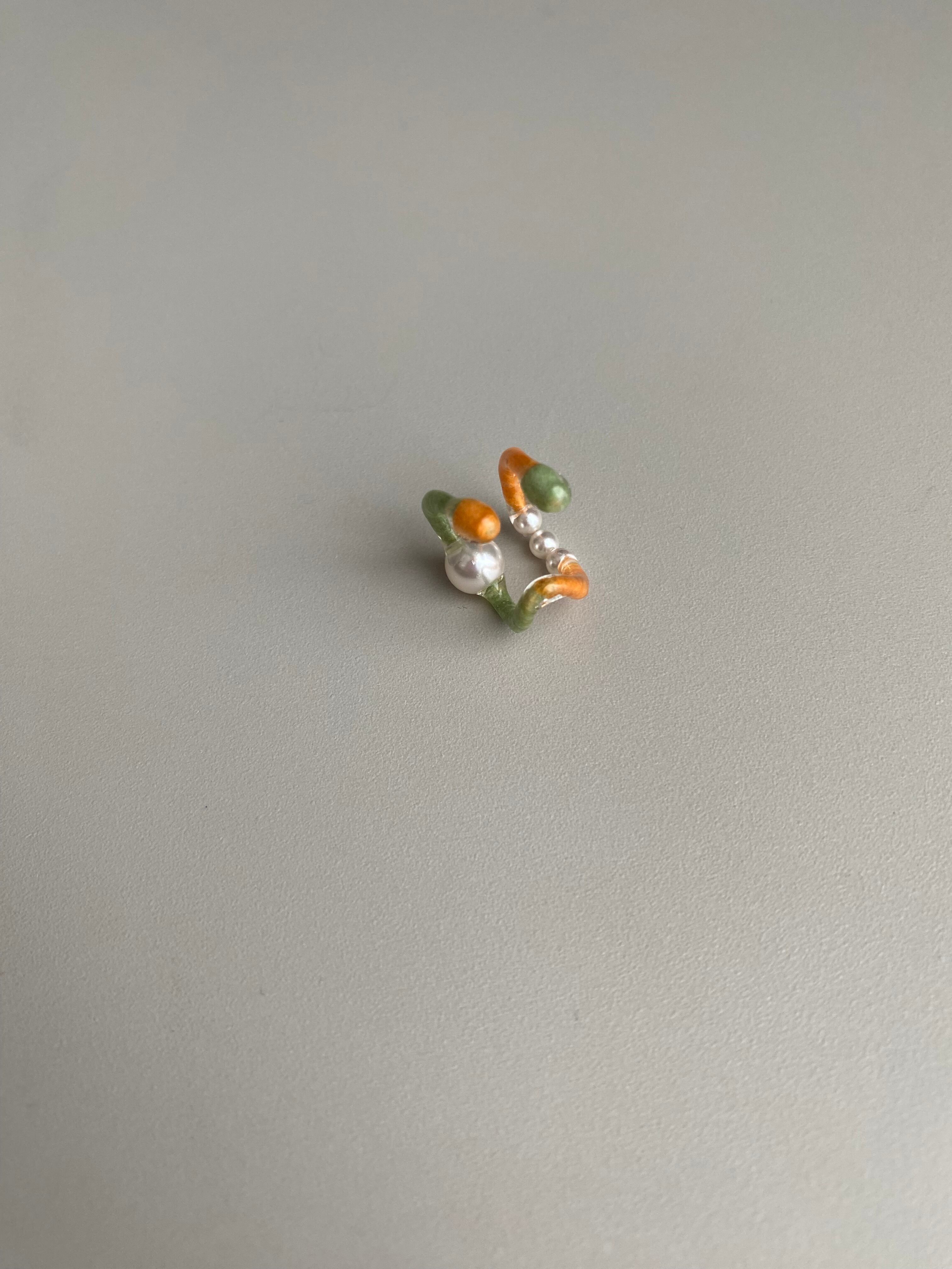 合わせたガラス、ビーズ、パールなどが、軌道をすすむ惑星のように見えたので〈planetイヤーカフ〉と名付けました。