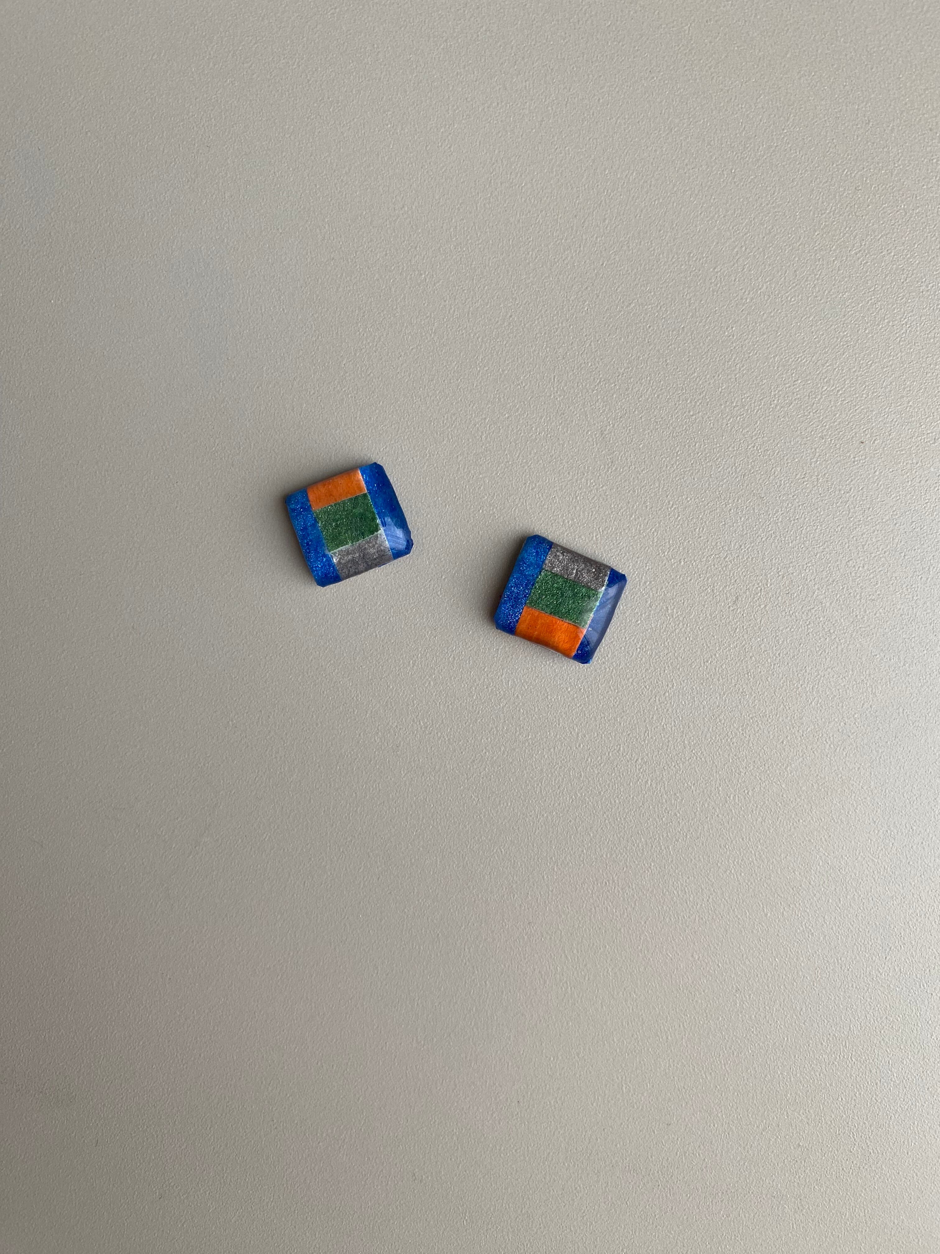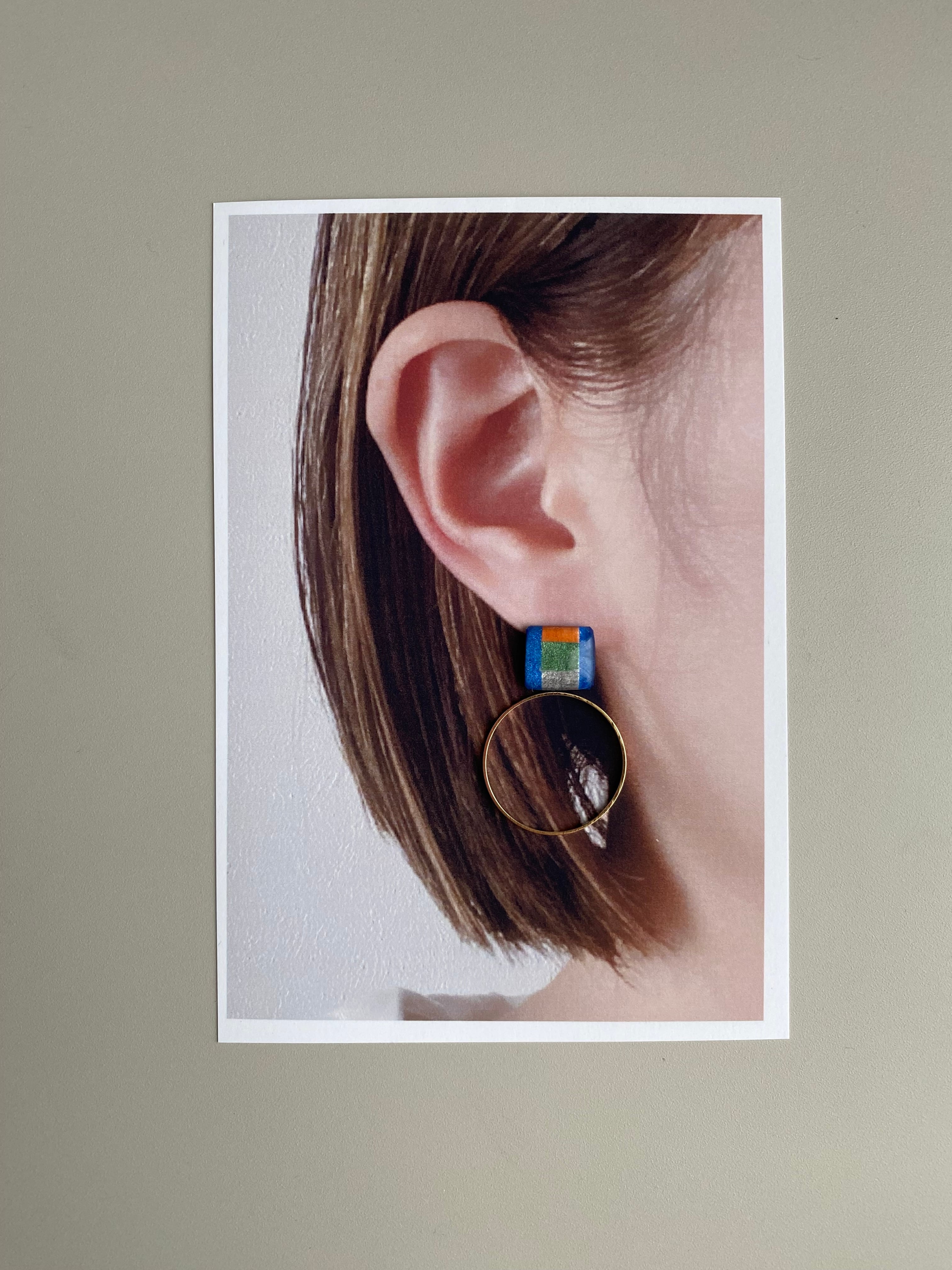 彩色した紙を小さな四角にコラージュし、華奢なメタルフープを合わせました。