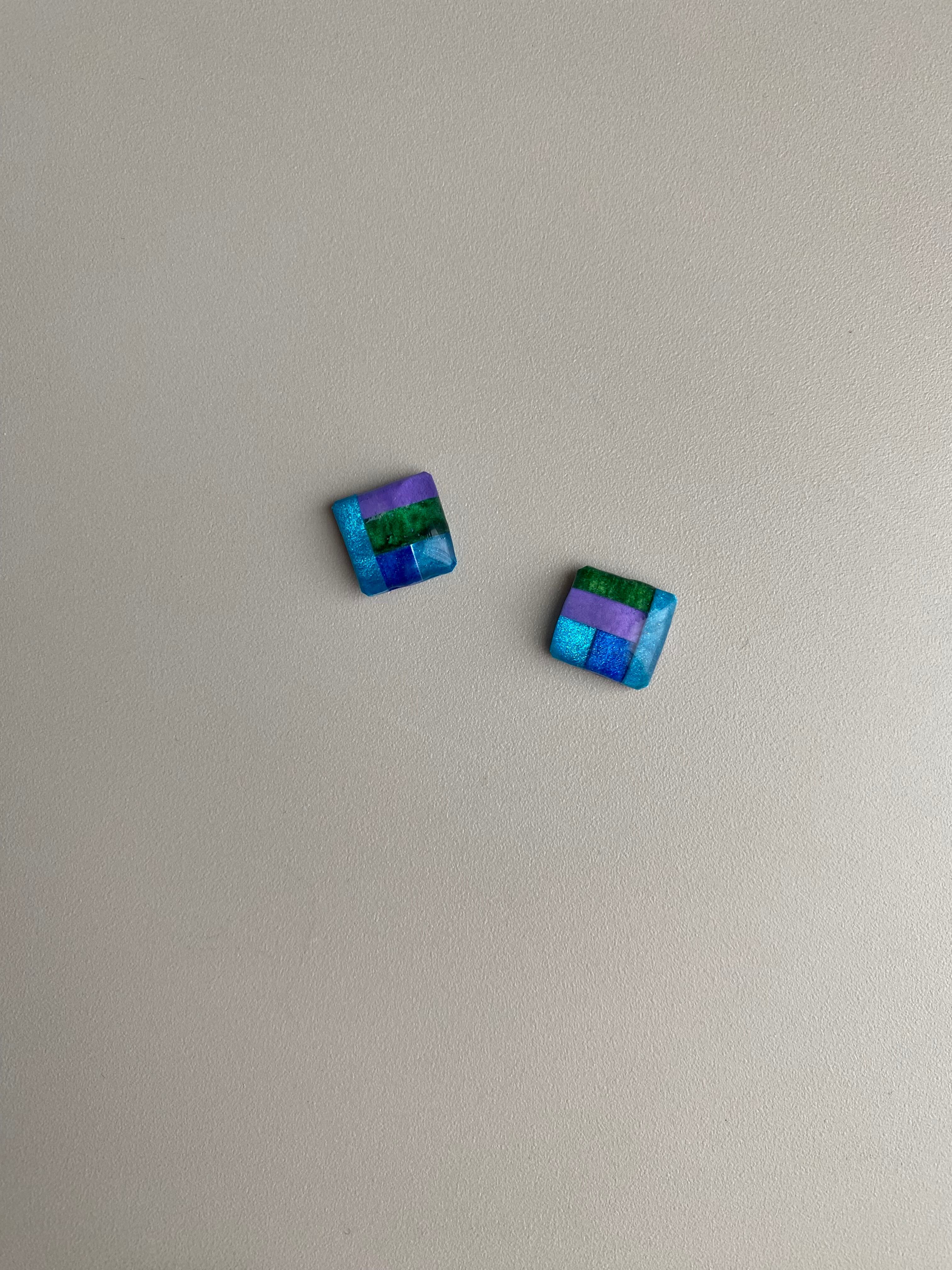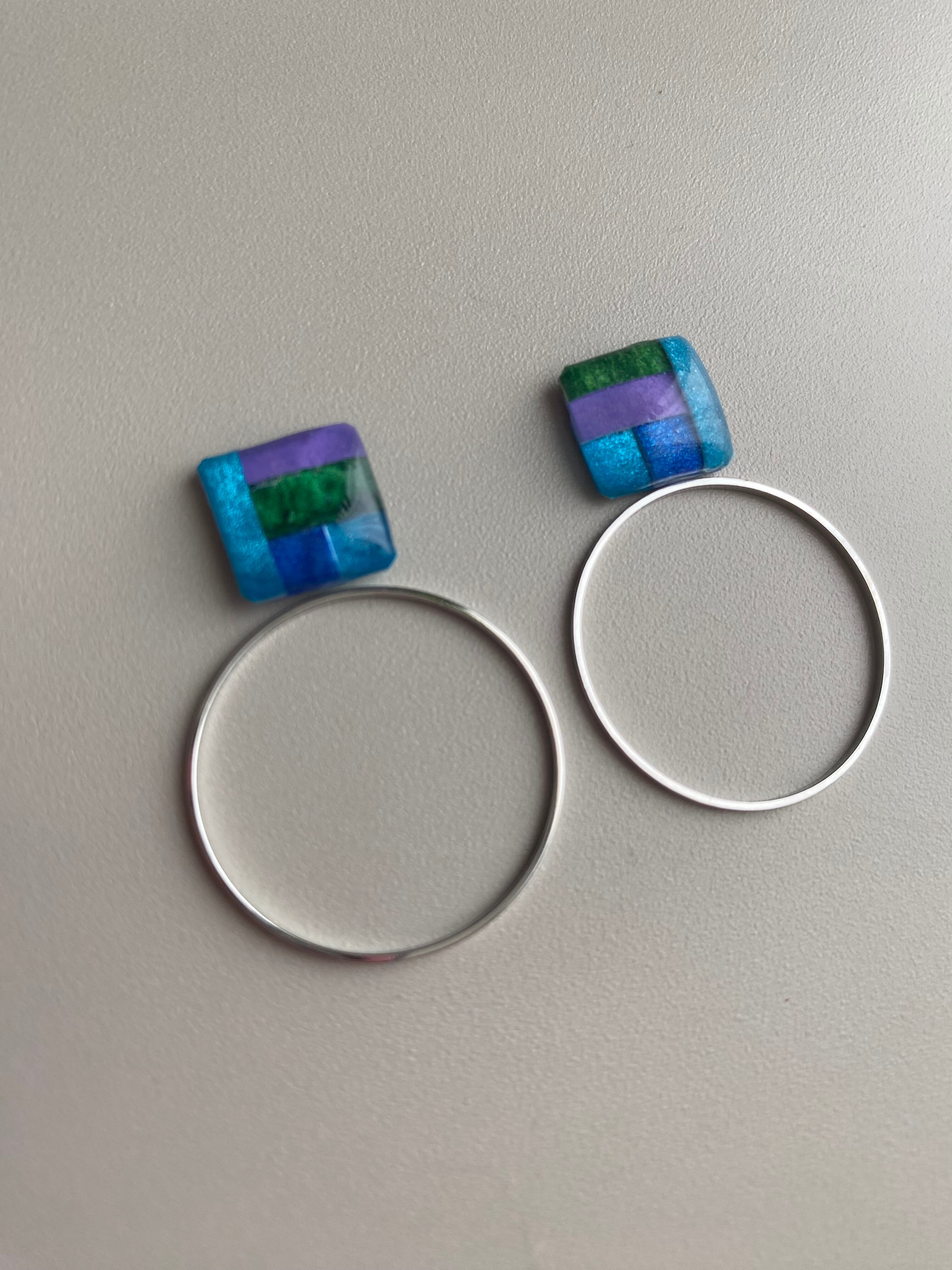 彩色した紙を小さな四角にコラージュし、華奢なメタルフープを合わせました。