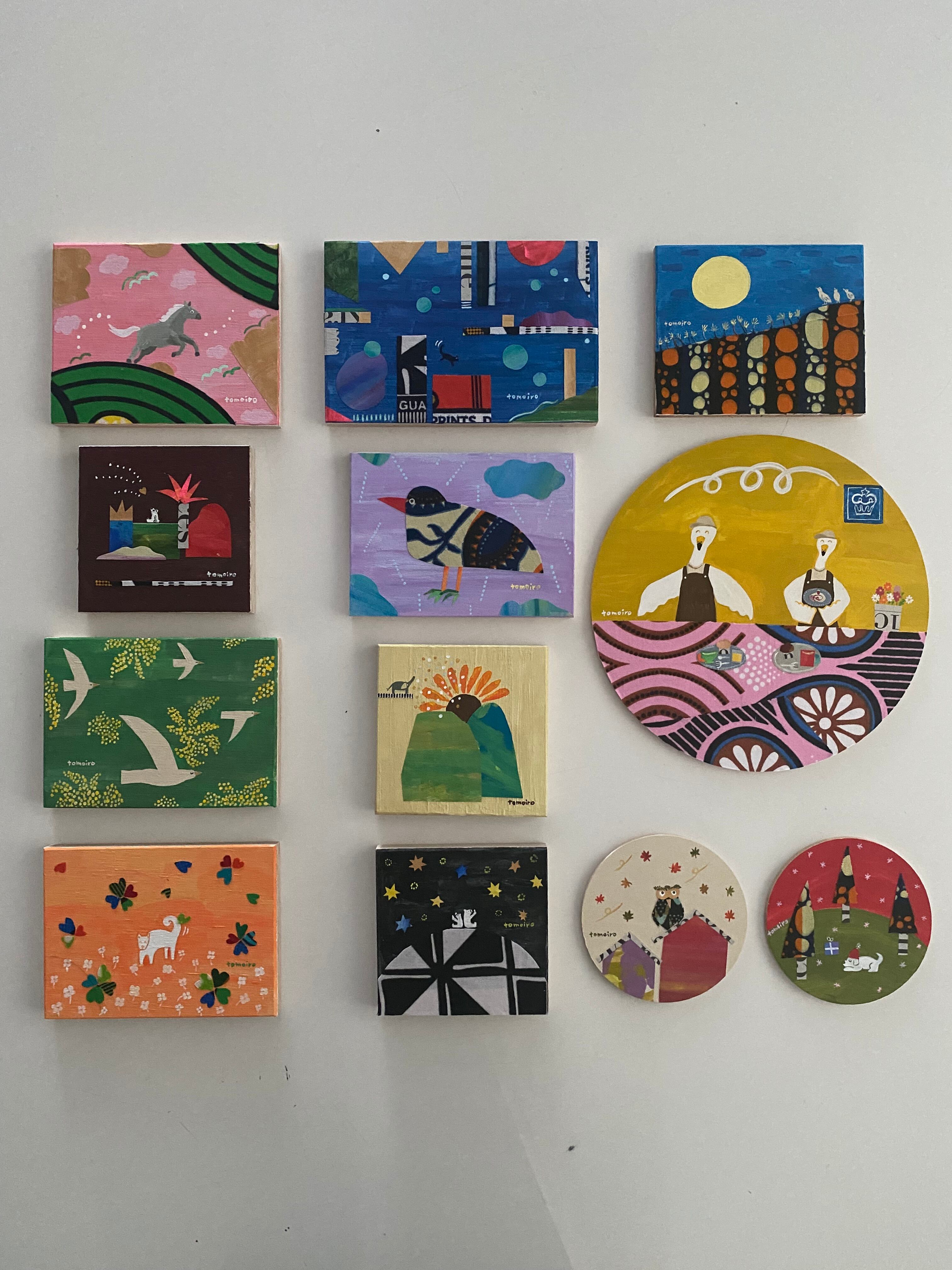 絵の具で描いたり、アフリカ布の端切れや英字新聞を貼ったりしたオリジナルドローイングをポストカードサイズのカレンダーに仕上げました。