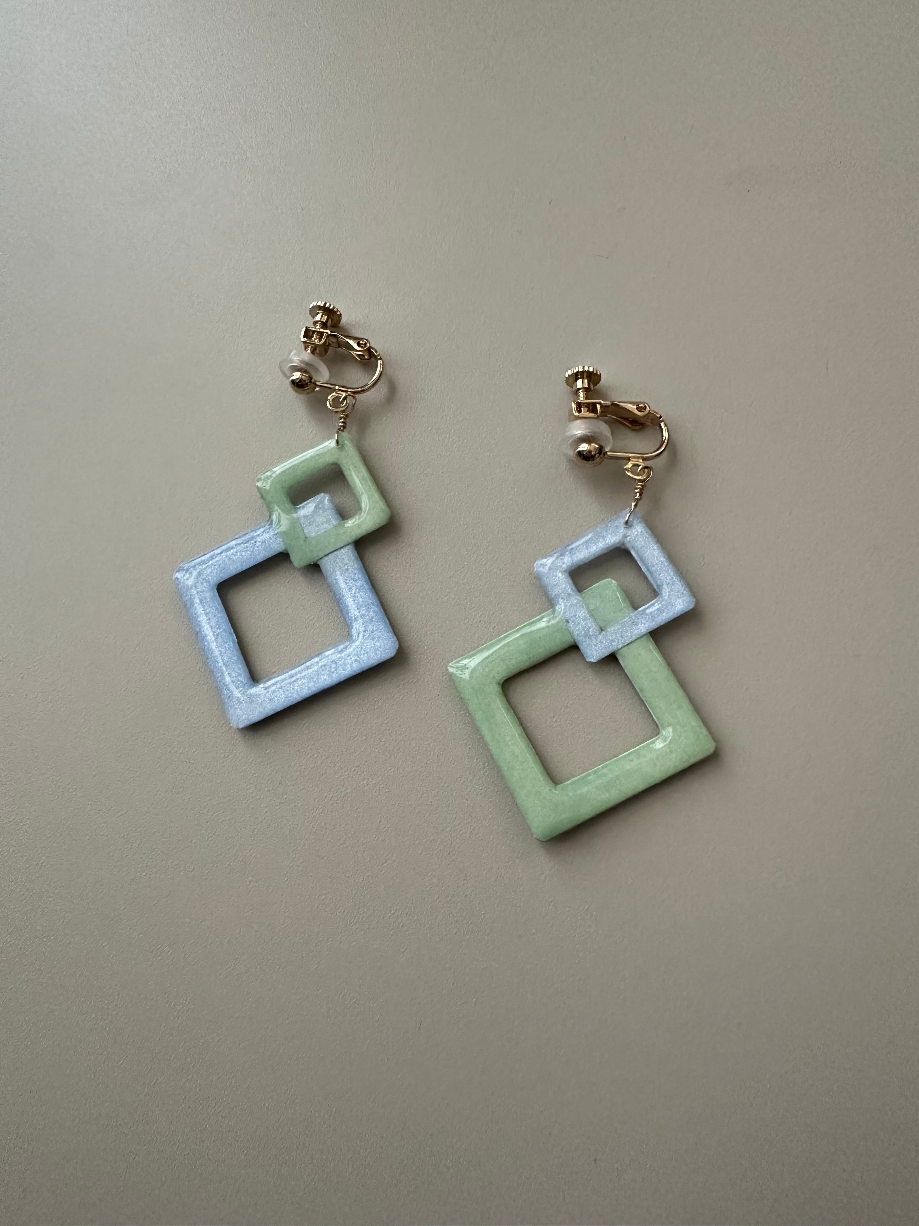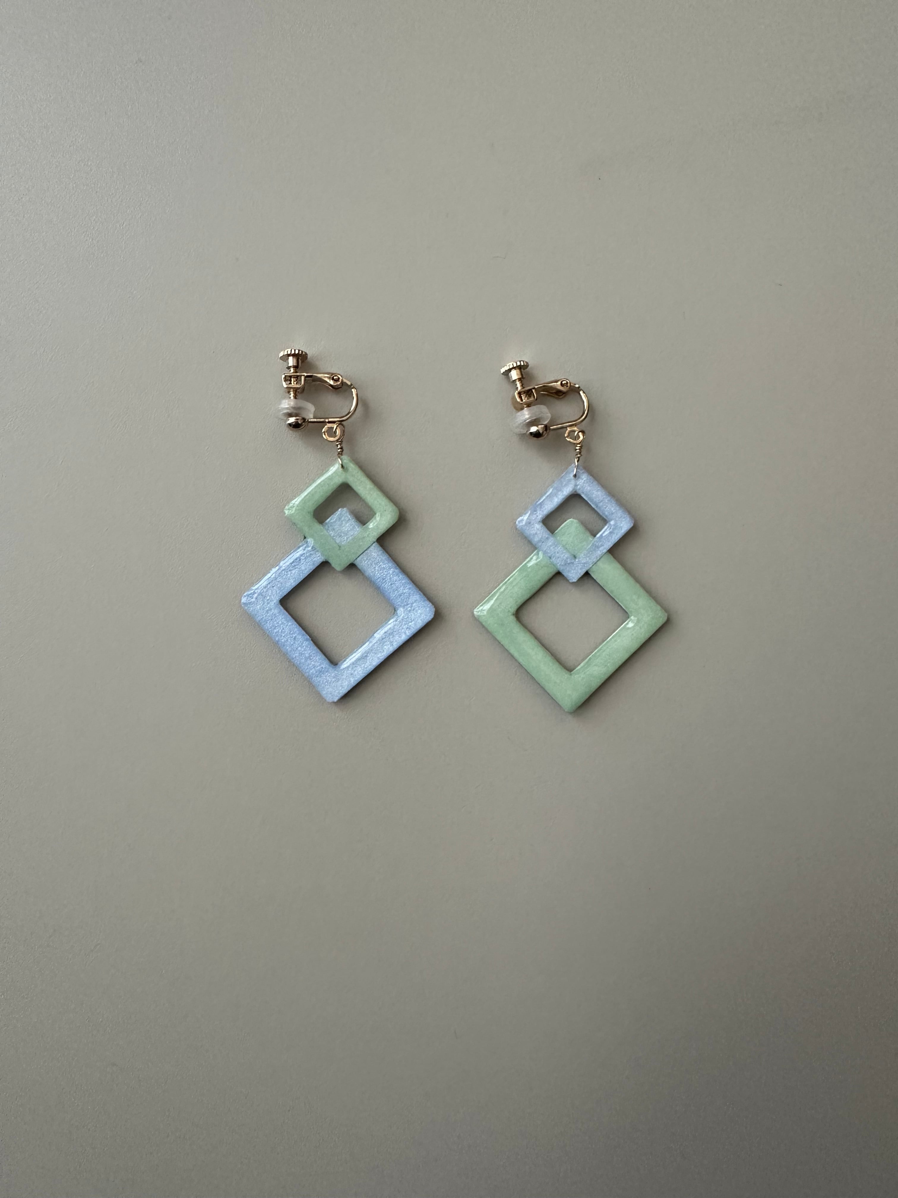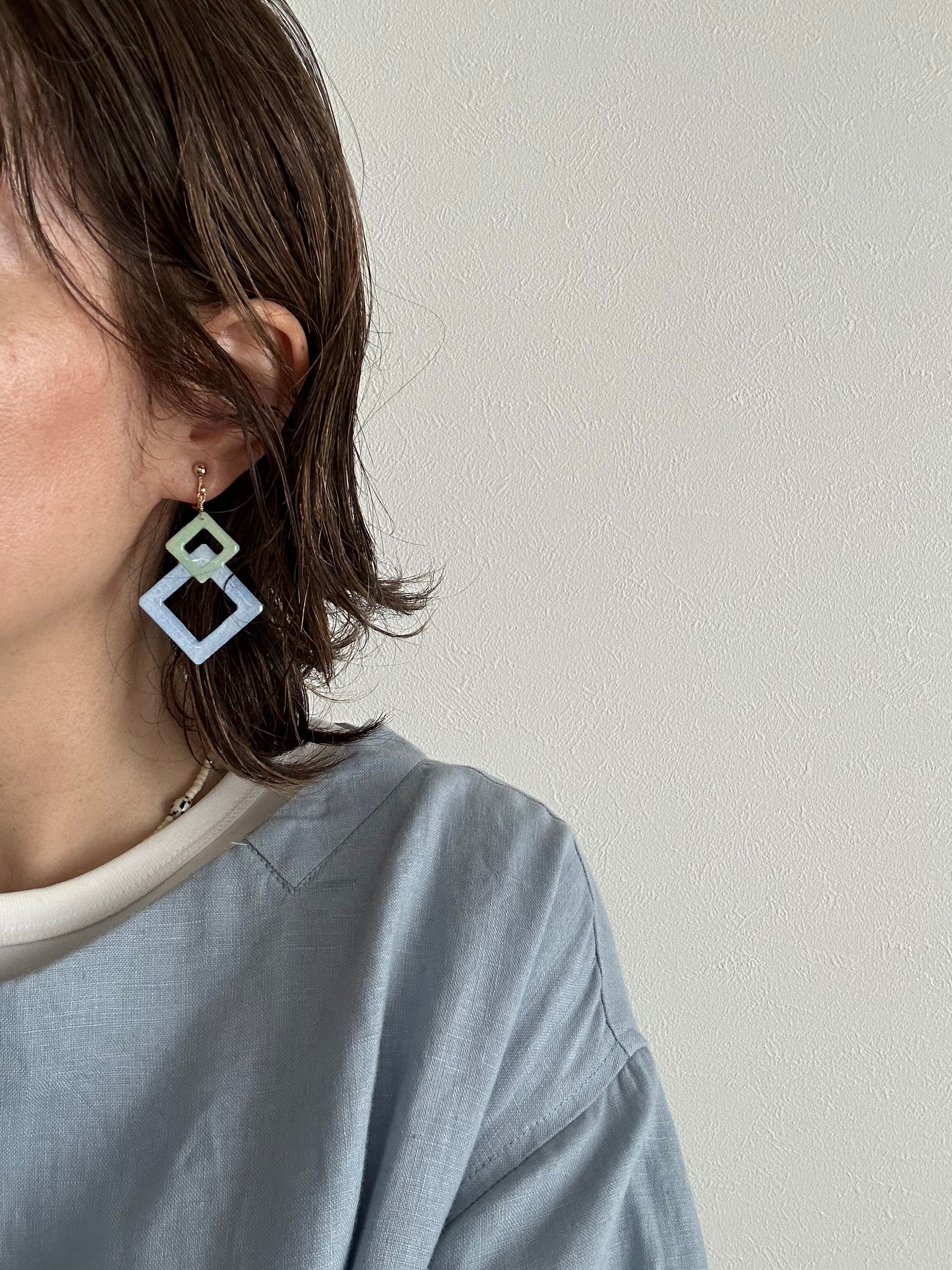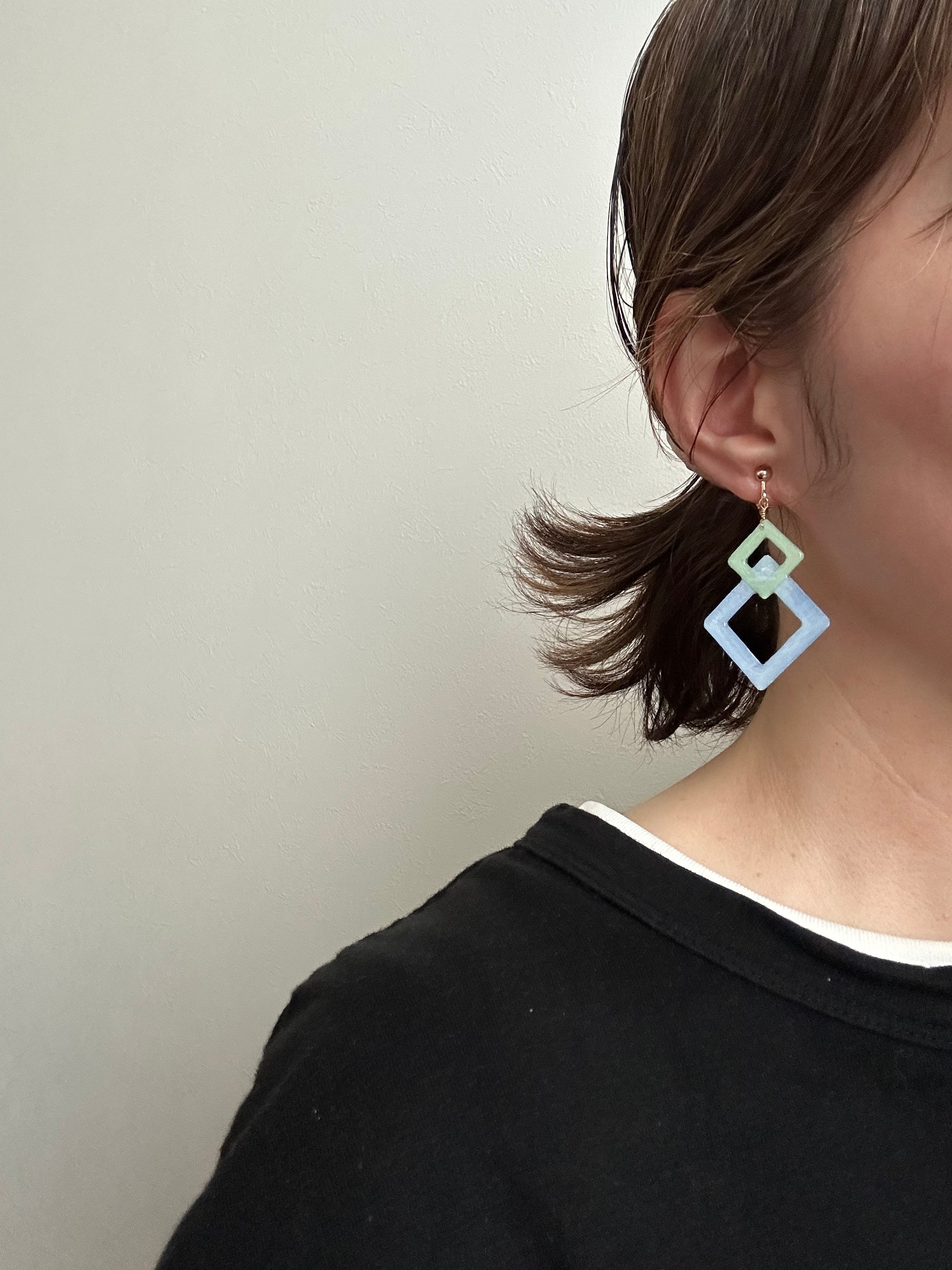 自ら彩色した紙を、大小の菱形にくり抜いて重ねました。アップヘア、ショートヘアなどお耳元がスッキリとしたスタイルにおすすめ。