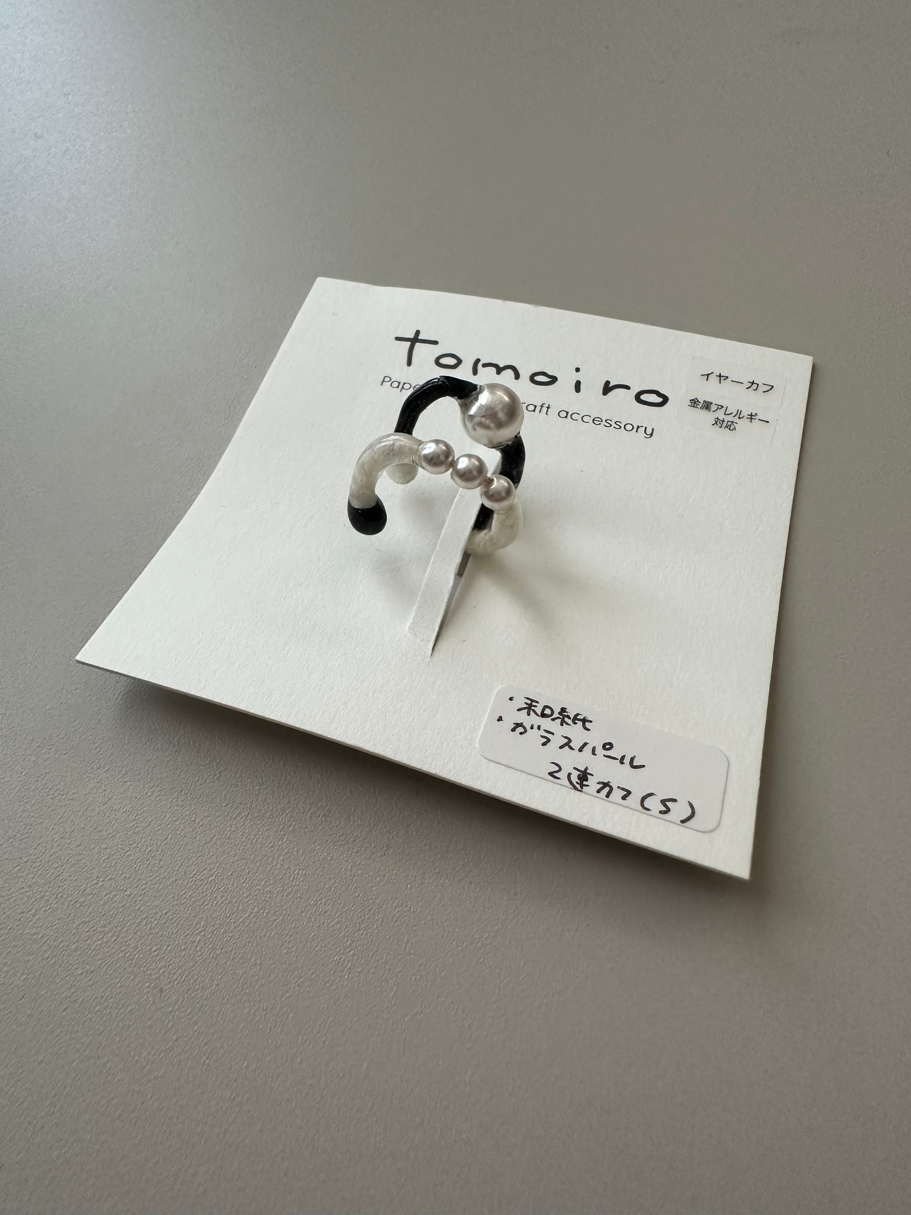 合わせたガラス、ビーズ、パールなどが、軌道をすすむ惑星のように見えたので〈planetイヤーカフ〉と名付けました。