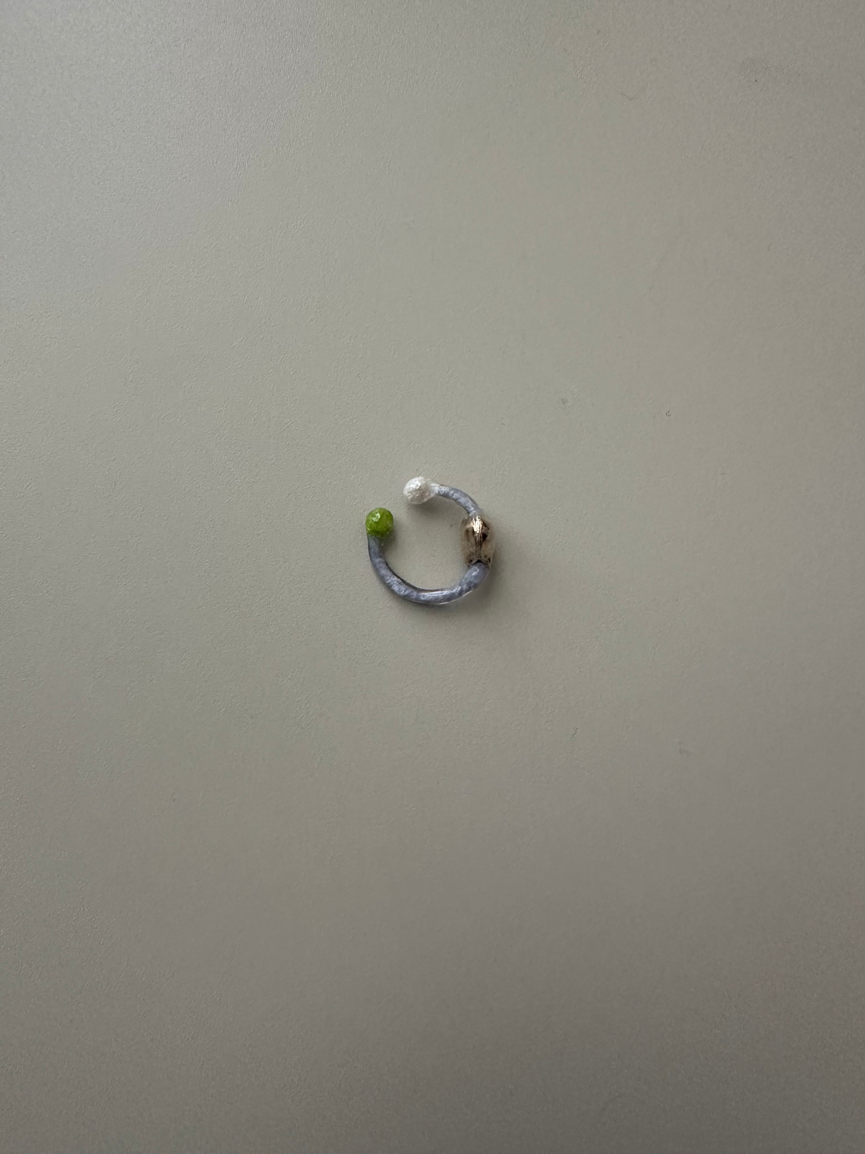 合わせたガラス、ビーズ、パールなどが、軌道をすすむ惑星のように見えたので〈planetイヤーカフ〉と名付けました。